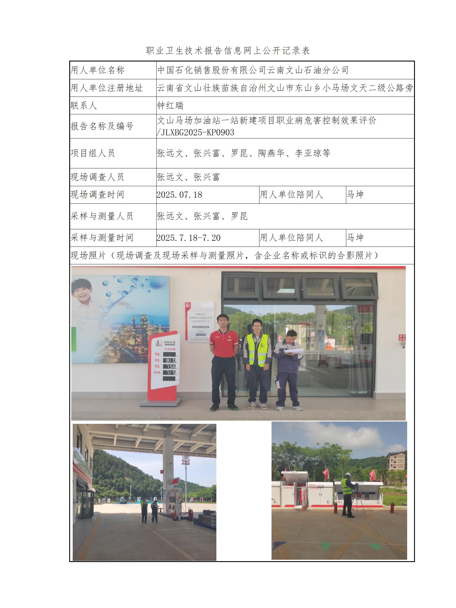 文山馬場加油站一站新建項目職業病危害控制效果評價