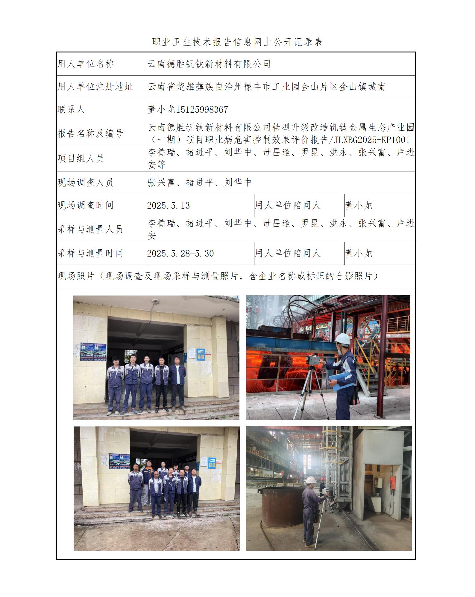 云南德勝釩鈦新材料有限公司轉型升級改造釩鈦金屬生態產業園(一期)項目職業病危害控制效果評價報告