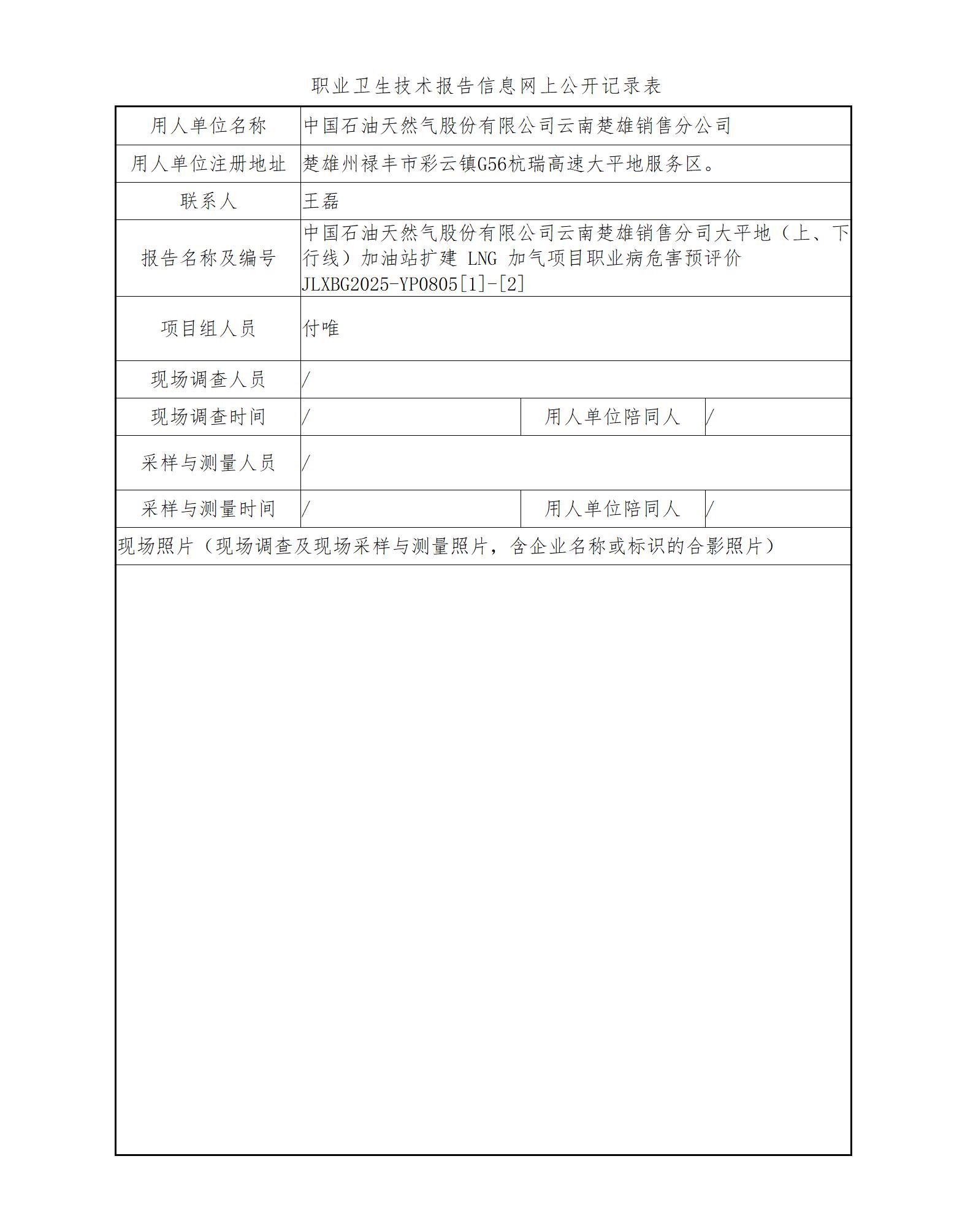 中國石油天然氣股份有限公司云南楚雄銷售分司大平地(上、下行線)加油站擴建 LNG 加氣項目職業病危害預評價