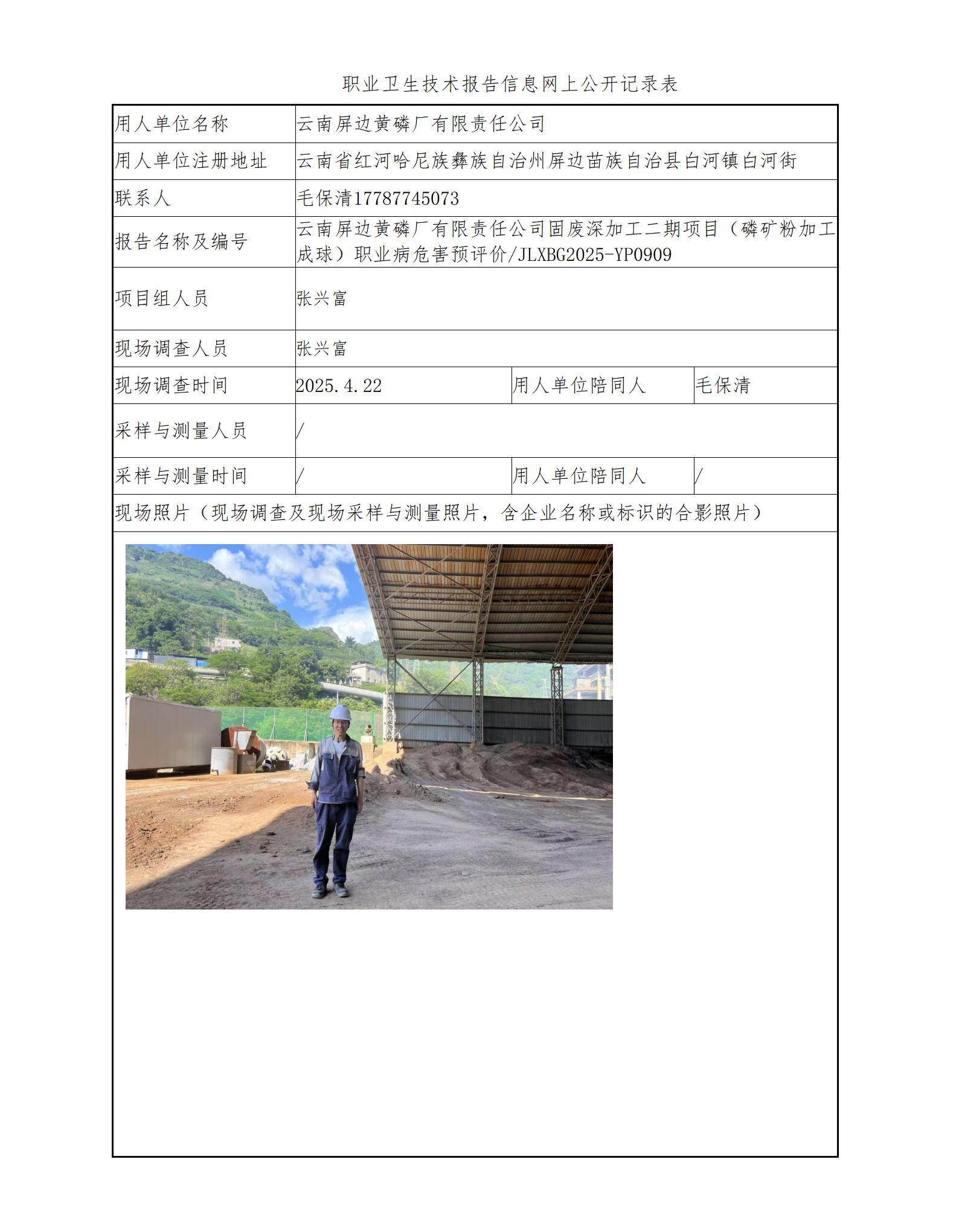 云南屏邊黃磷廠有限責(zé)任公司固廢深加工二期項(xiàng)目(磷礦粉加工成球)職業(yè)病危害預(yù)評價(jià)